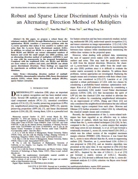 近日,我校管理学院李春娜副教授撰写的“Robust and sparse linear discriminant analysis via alternating direction method of multipliers”在信息处理和智能计算领域顶级期刊《IEEE Transactions on Neural Networks and Learning Systems》(SCI 一区,最新影响因子为11.683) 接收发表。 该期刊为IEEE神经网络协会、IEEE 计算智能协会主办,是IEEE计算智能学会核心刊物,神经网络和学习系统方面的国际顶级杂志。
