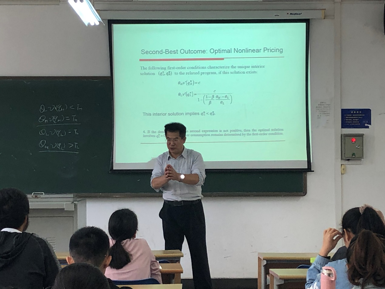 在学术交流期间,赵瑞清教授做了四场《合同理论》系列讲座。讲座由赵达副院长主持,学院蔡东宏教授、熊浩教授、陈赞章副教授、吉清凯副教授等教师和部分博士、硕士研究生参加了讲座。