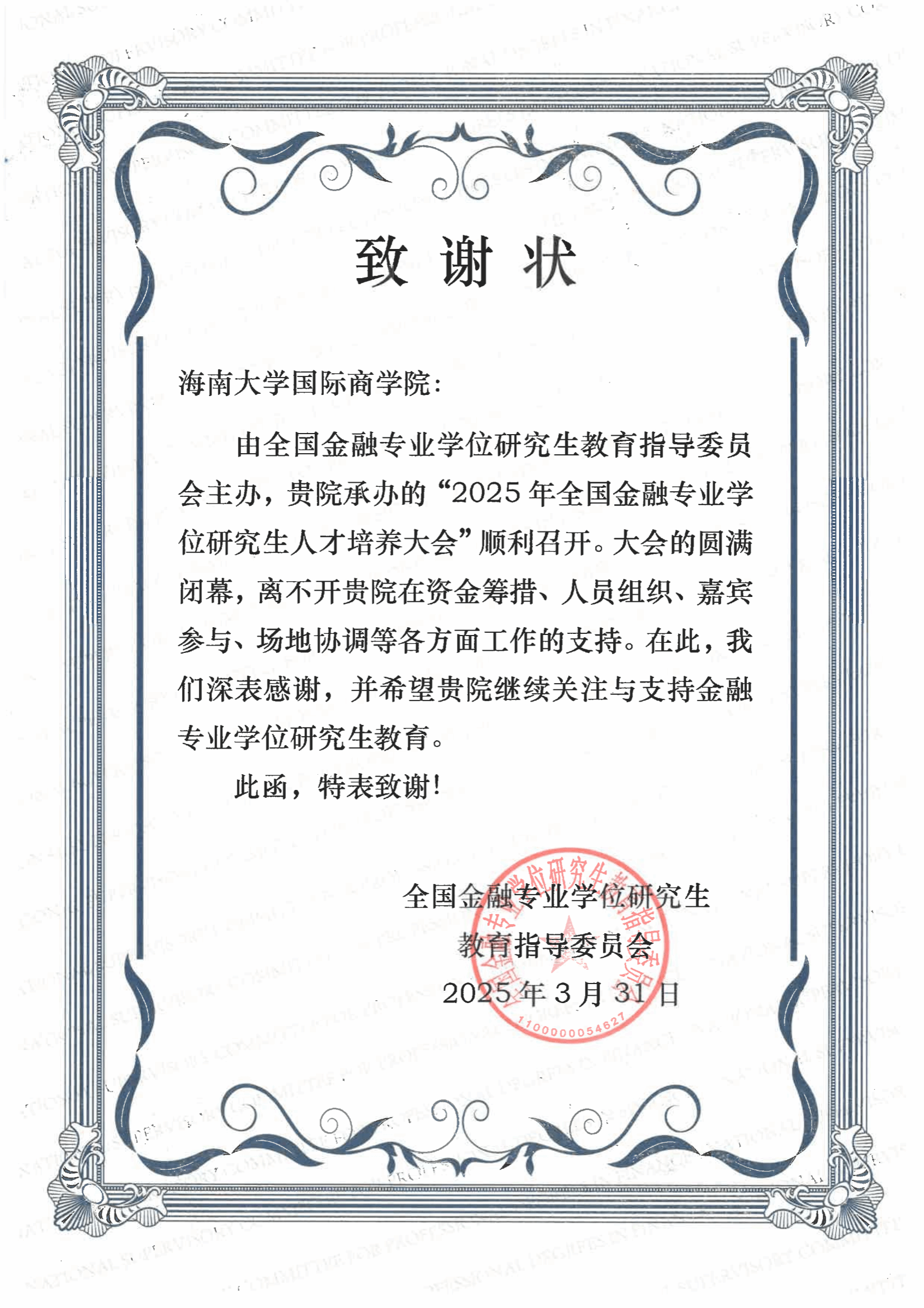 收到全国金融专业学位研究生教育指导委员会(简称全国金融专硕教指委)发来的致谢状,肯定学院对“2025年全国金融专业学位研究生人才培养大会”的出色承办。该会于2025年3月29日至30日在海南海口星海湾铂尔曼酒店召开。大会以“高水平金融开放与高质量金融人才培养”为主题,汇聚了来自全国百余所高校学科带头人、金融机构高管及行业专家等近300名代表参会,共商新时代金融教育改革与人才强国战略。