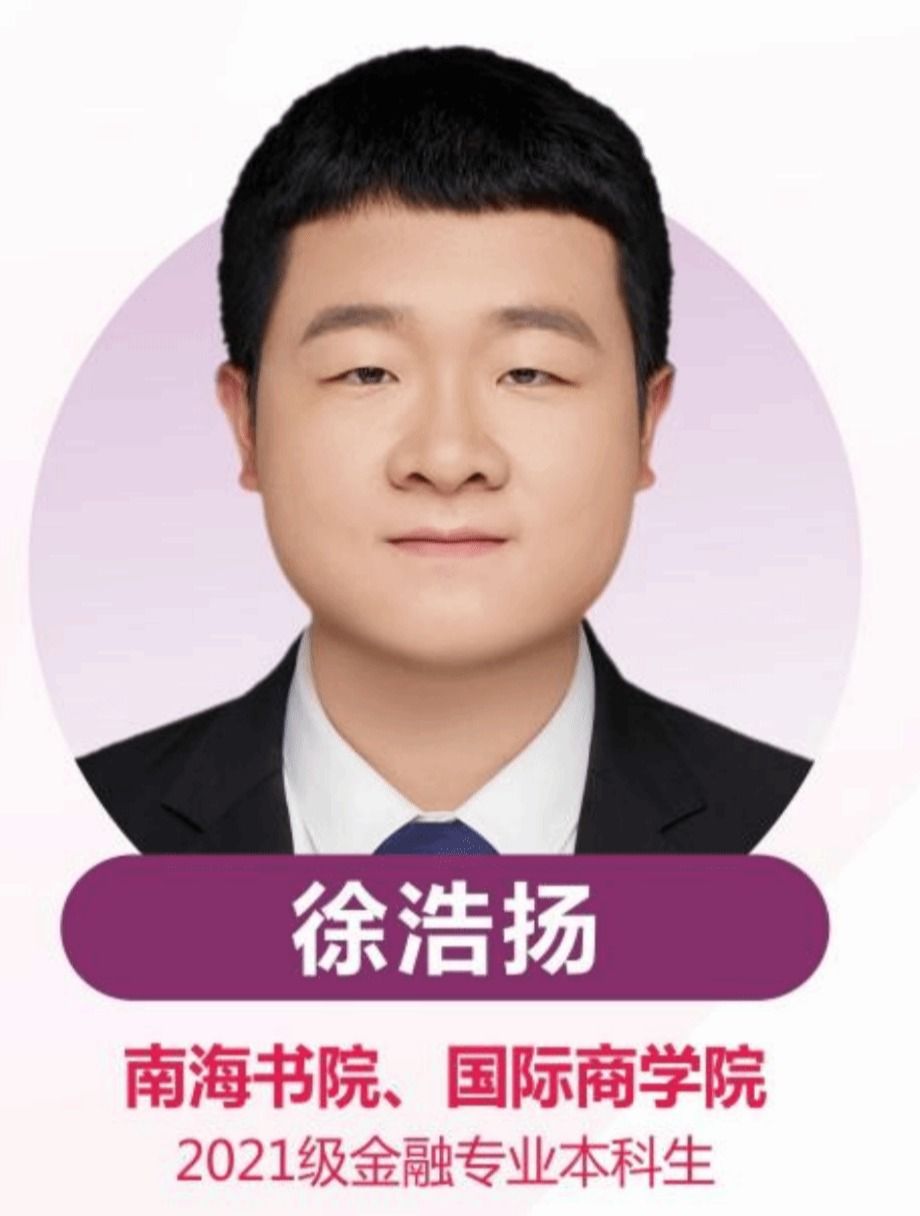 2021级工商管理专业本科生。先后获中国国际大学生创新大赛(2023)全国金奖等奖项40余项,主持国家级大学生创新创业训练项目2项,以独立发明人授权国家发明专利1项,参与发表SCI一区期刊论文1篇。致力于推广环境DNA检测技术,任广州千潮生态科技有限公司总经理,公司获评“国家科技型中小企业” “海南省科技型中小企业”。现已被录取至爱丁堡大学攻读硕士学位。