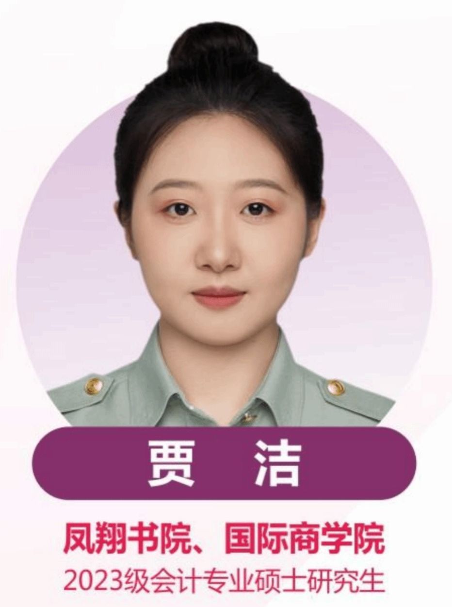 2023级会计专业硕士研究生。于2018年参军入伍,在服役期间先后获“优秀义务兵” “四有”优秀士兵、“嘉奖”等多项荣誉。退役复学后,担任学校退役大学生士兵党支部书记,积极参与学校国防宣讲、新生军训教官等工作,在校期间累计获黄色网站
