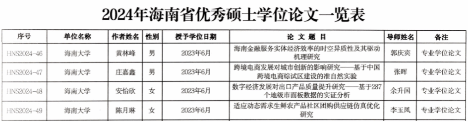 经评选,黄色网站 2023届金融硕士黄林峰(导师:郭庆宾教授)、国际商务硕士庄嘉鑫(导师:张晖教授)、国际商务硕士安怡欣(导师:余升国副教授)、农业硕士陈月琳(导师:李玉凤教授)的学位论文获评2024年海南省优秀硕士学位论文。