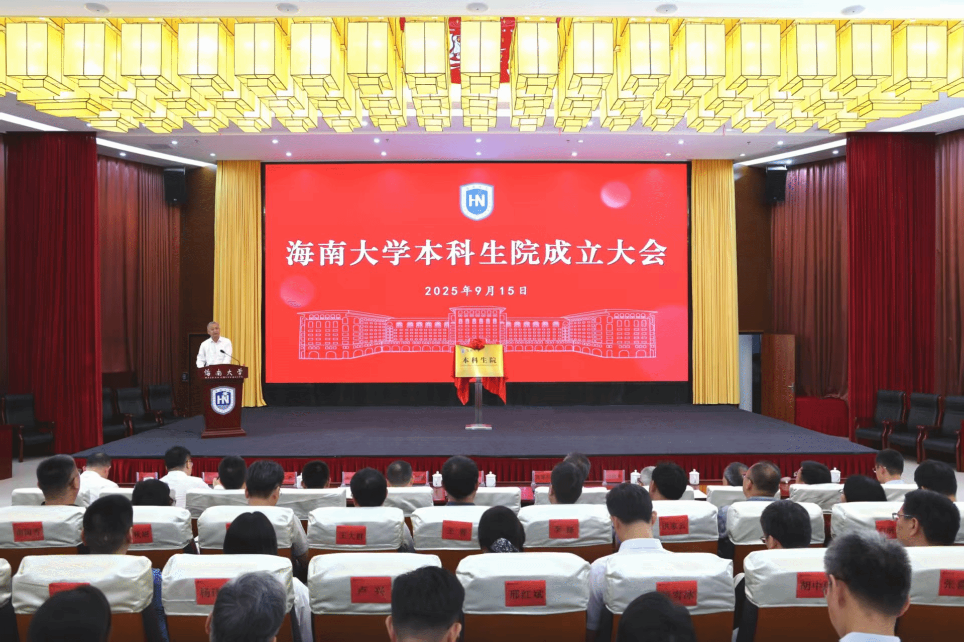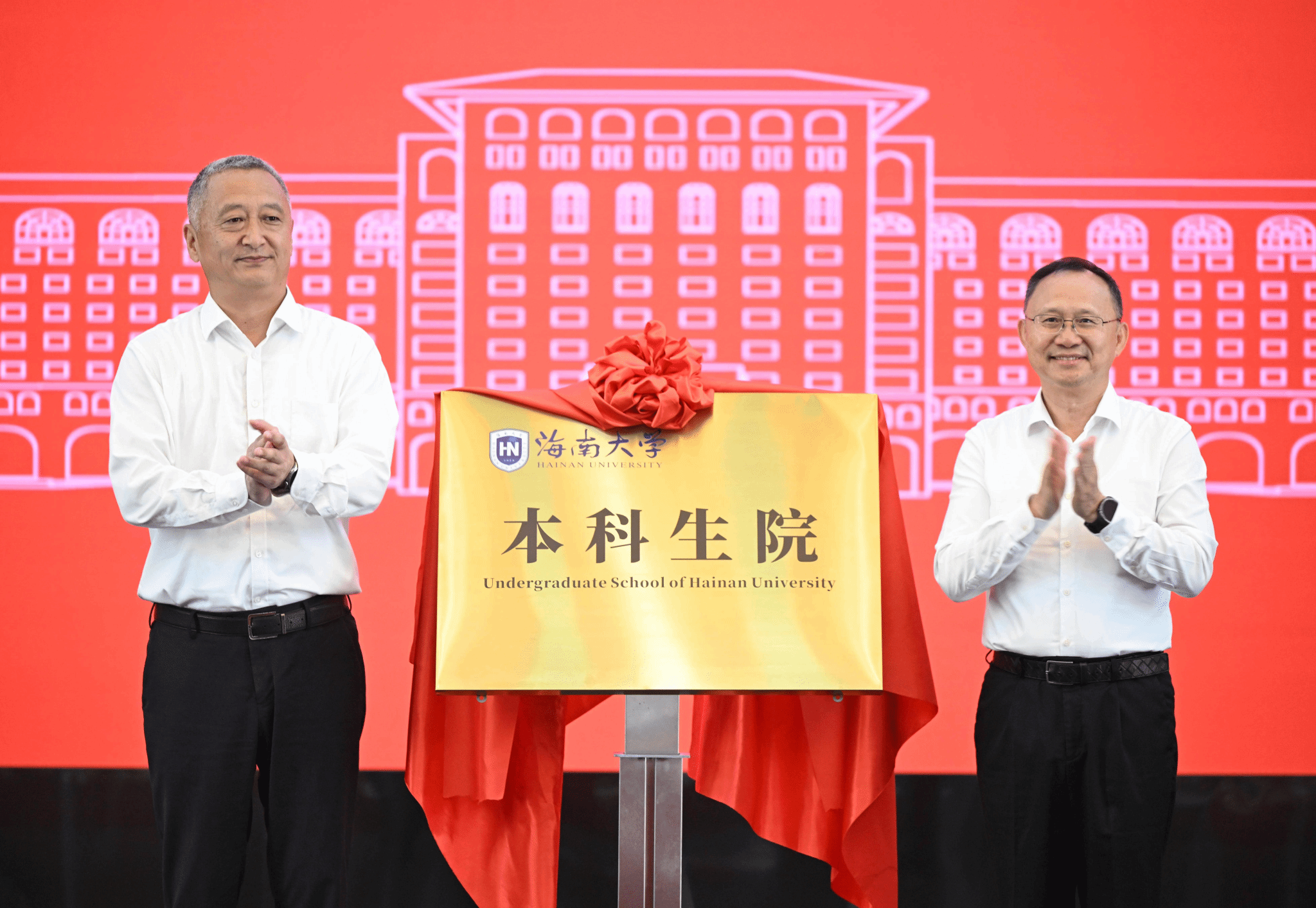 本科生院成立大会在社科楼二楼报告厅召开。这是李湖和骆清铭共同为本科生院揭牌。张杨越 摄