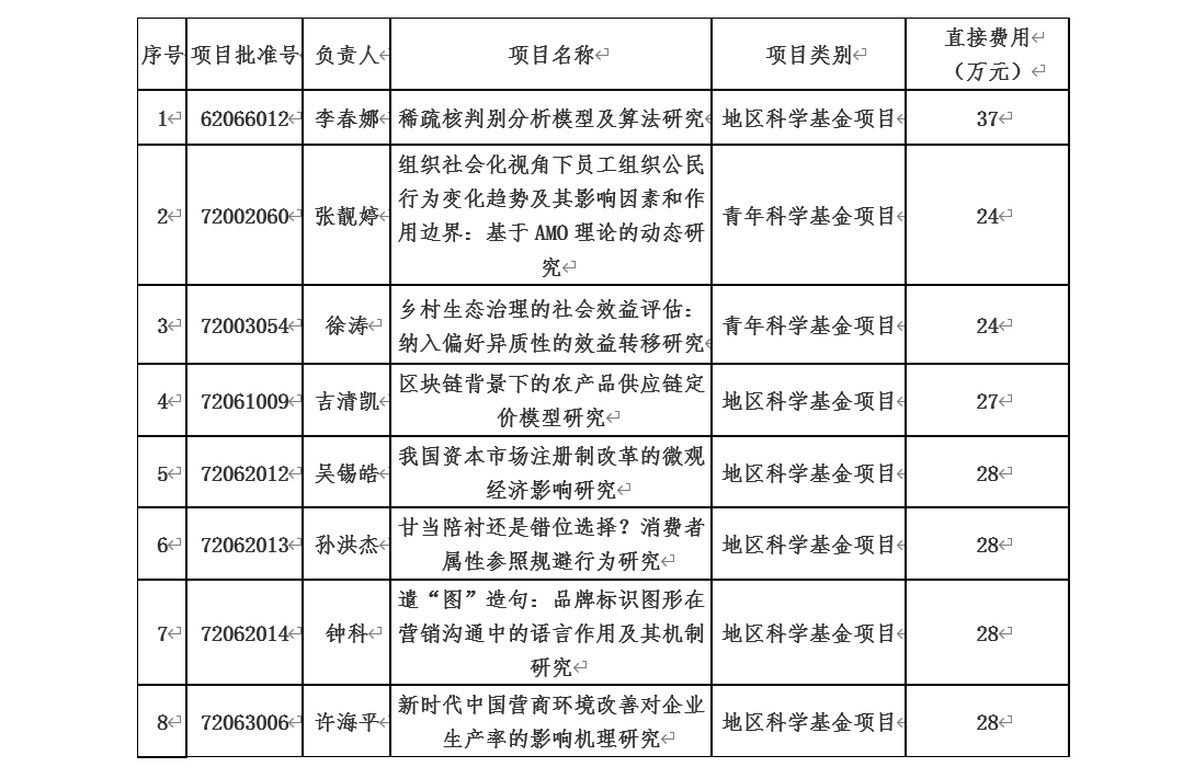 管理学院获批国家自然科学基金项目8项(均为管理科学部),获批数在全校排名第2(并列),在全校人文社科类学院排名第1,申请获批率为25%,高于2020年度全国平均水平。根据国家自然科学基金委员会此前公布的信息,2020年度国家自然科学基金资助率约在15.88%左右,而2014-2019年,管理科学部在国家自然科学基金委员会八大学部中平均资助率最低,仅为18.41%左右。