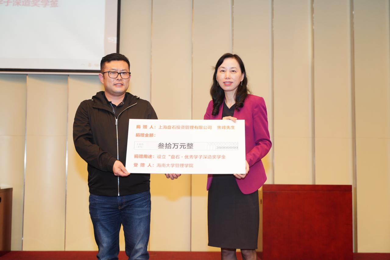 管理学院办学40周年校友返校日系列活动中,为支持学院发展,广大校友捐款捐物,捐赠赣南璞实有机橙、茶叶、五菱宏光Mini电动车等物资,并热烈响应40元倍数捐款活动,截至目前各方捐款共计十余万元。上海盘石投资管理公司董事长焦峰先生捐资三十万元,设立“盘石·优秀学子深造奖学金”。该奖学金旨在为管理学院推免或成功考取研究生且表现优异的全日制本科生提供物质支持与奖励,鼓励优秀学子深造,进一步提高管理学院的人才培养质量。相信在广大校友与社会爱心人士的关怀帮助下,管理学院一定会继往开来,努力建成区域内一流商学院,为自贸港建设培养出更多优质人才。