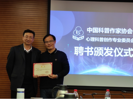 2020年12月18日,在北京中国科技会堂举办的中国科普作家协会第八次全国代表大会暨2020年年会上,管理学院教师傅安国被聘为新成立的心理学科普创作专业委员会副主任委员。中国科普作家协会理事长、国际著名古生物学家周忠和院士为其颁发聘书。