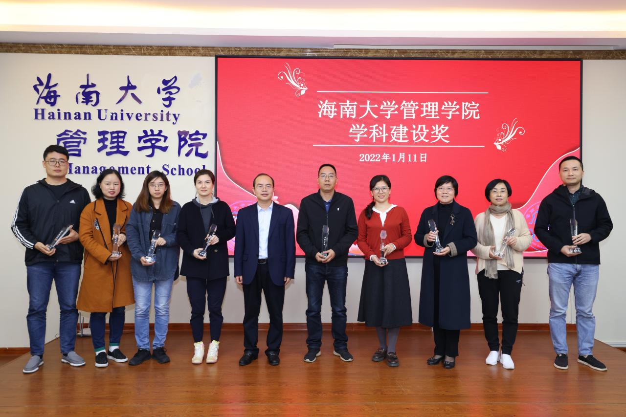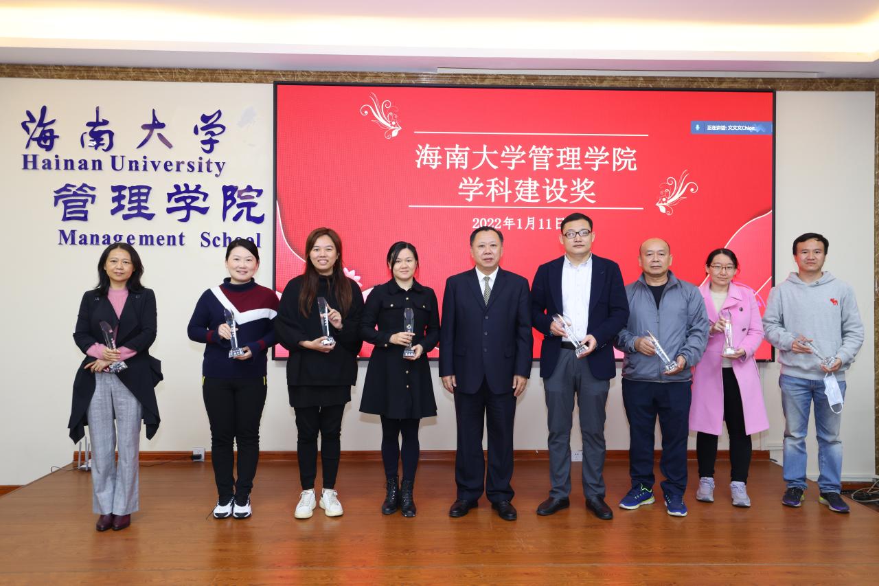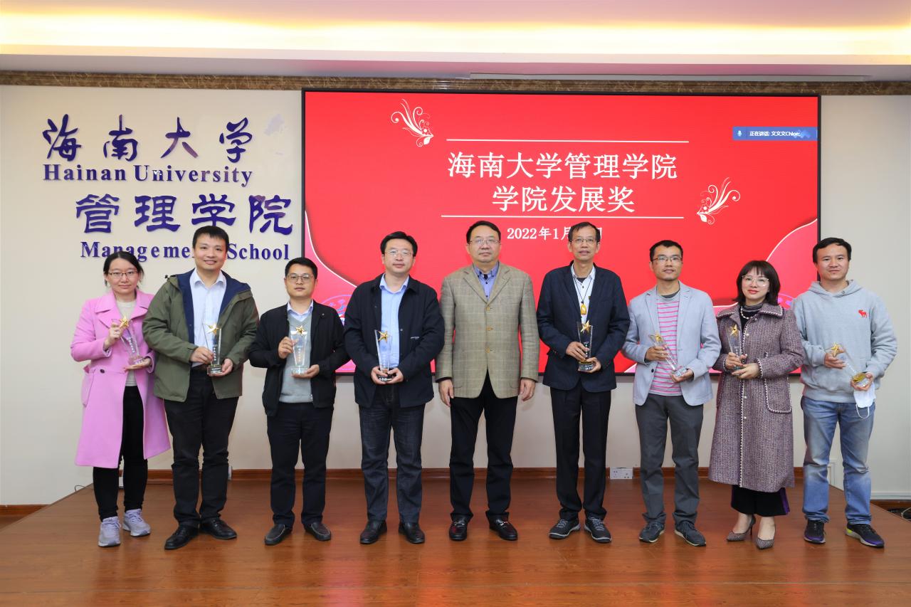 管理学院2021年学科建设奖和学院发展奖的获奖名单。傅国华及学院领导依次为获奖人员颁奖。