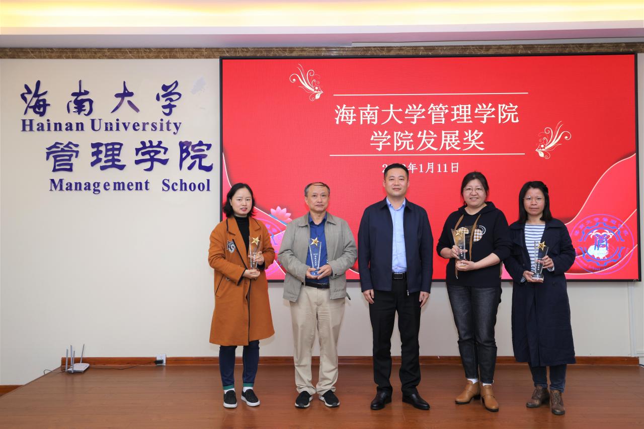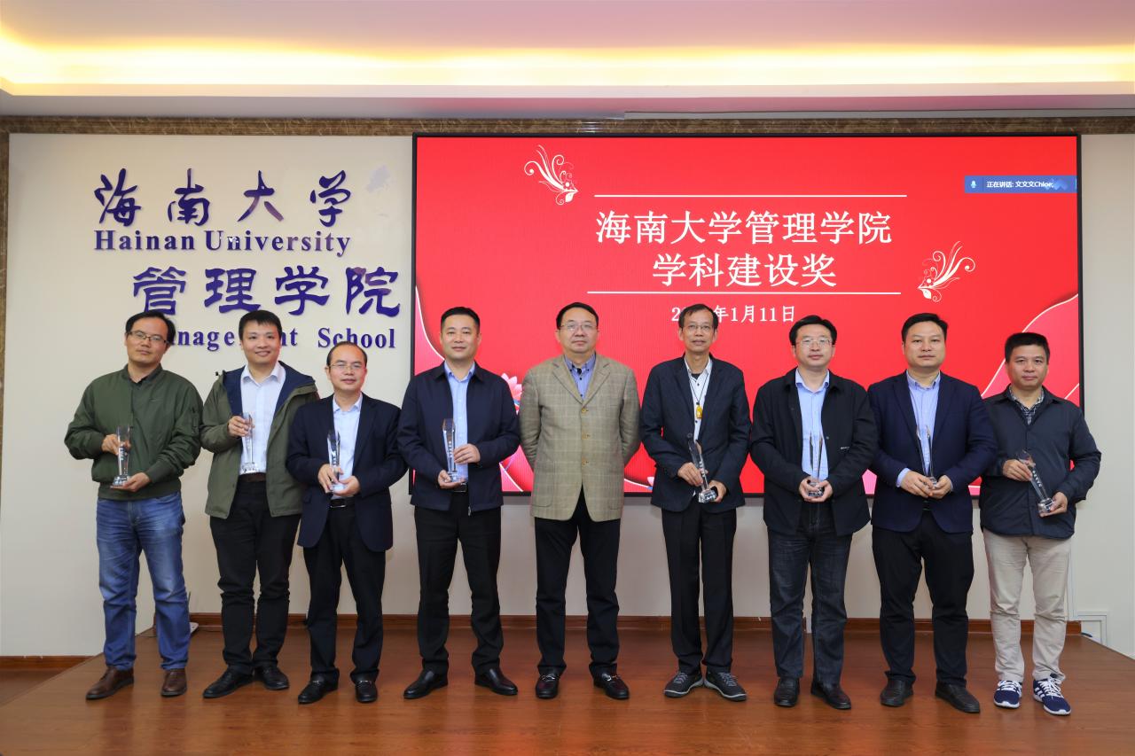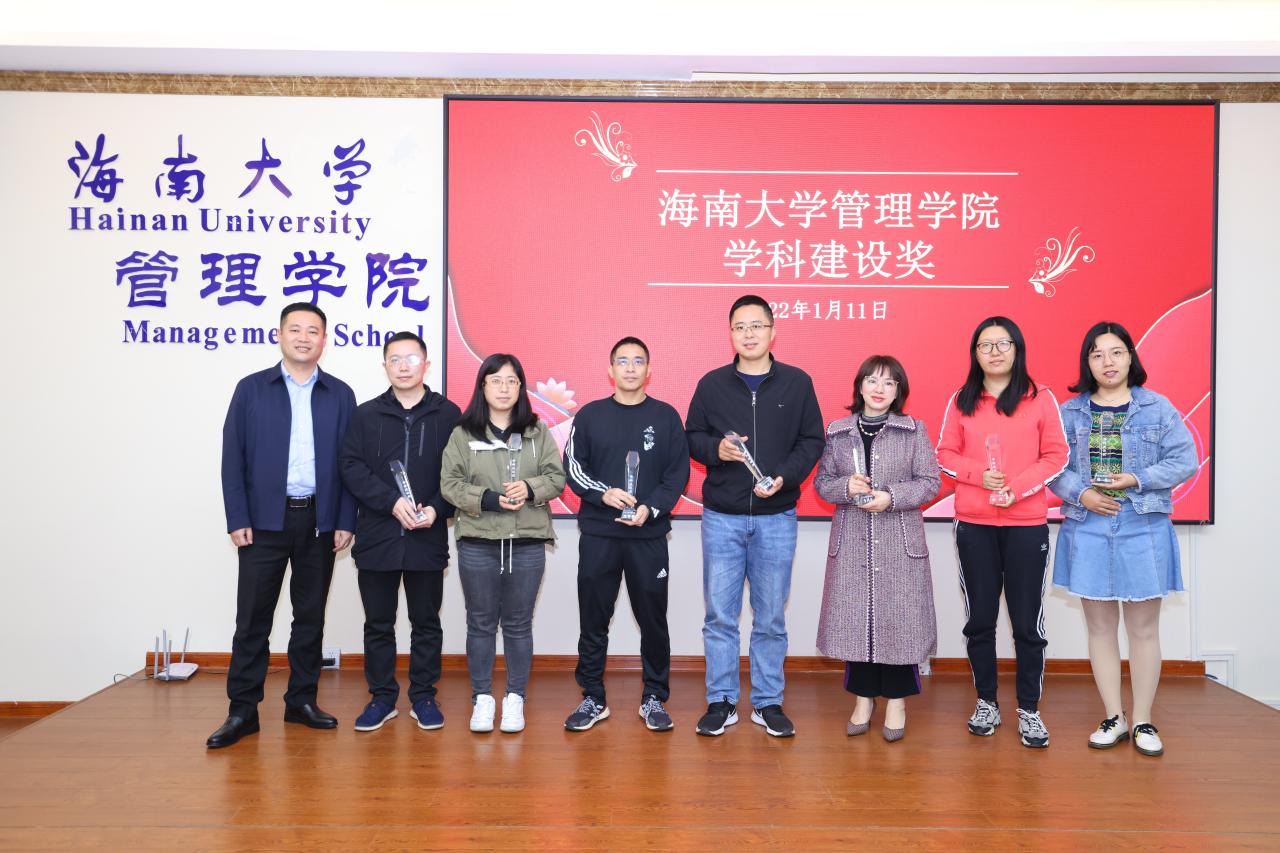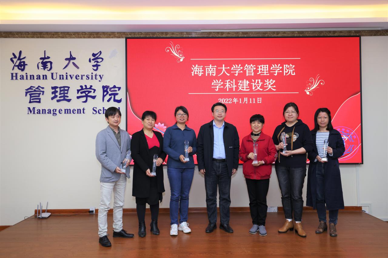 管理学院2021年学科建设奖和学院发展奖的获奖名单。傅国华及学院领导依次为获奖人员颁奖。