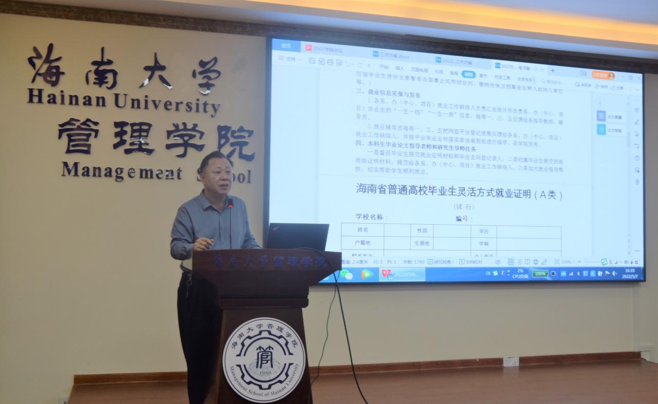 2022年5月7日下午,管理学院在社科楼B112学术报告厅召开师德师风“四评”工作暨毕业生就业工作会议。管理学院院长唐宁玉、党委书记邢谷川、副院长张德生、副院长付景涛以及天工书院党委副书记(主持工作)易振出席会议。各教工党支部书记、各系、办(中心/项目)主任及就业工作联系人参加会议。