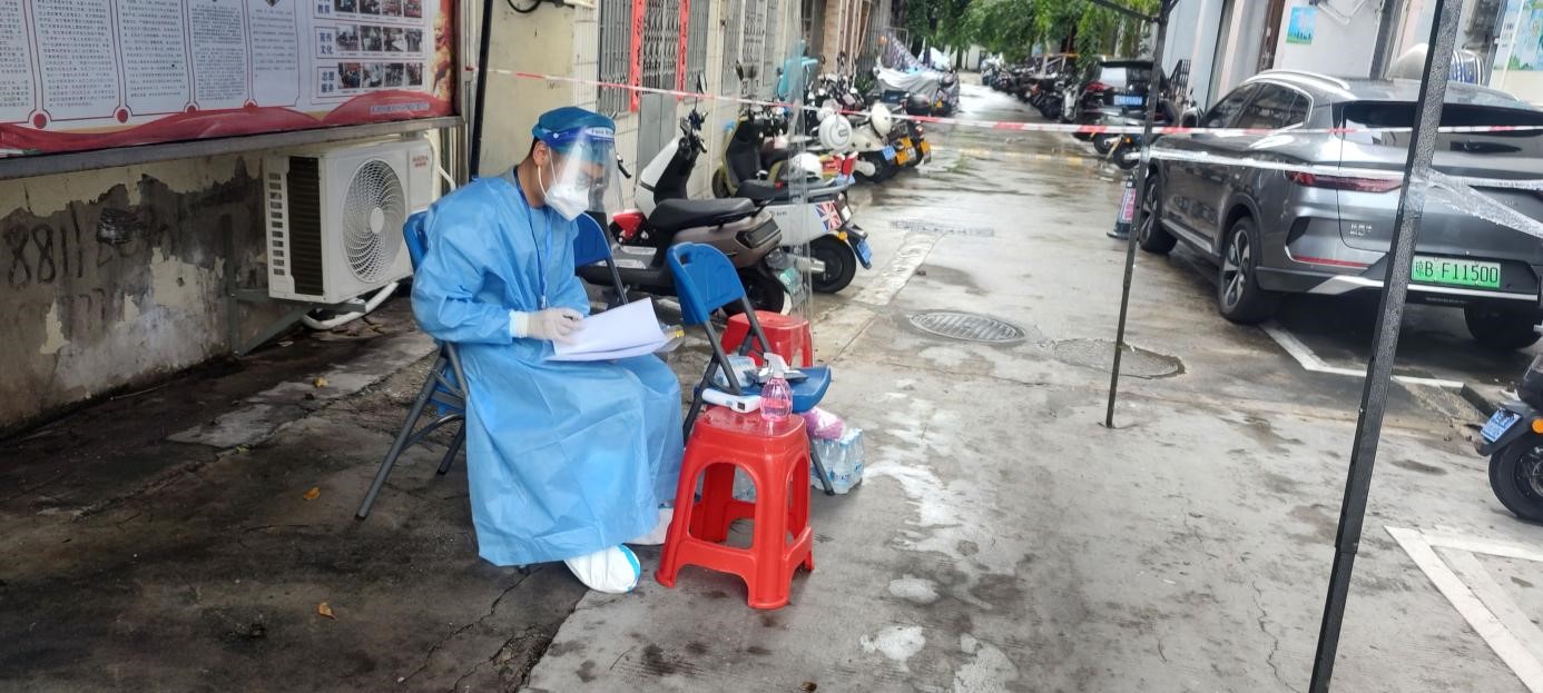 财务会计系的郑晓宇老师是北方人,入职海大不足一年,海南的气候和方言对他而言都是不小的挑战。台风鞍马来袭时,他顶着狂风大雨完成了户外执勤工作;封控区很多阿公阿婆不擅长普通话,他需要反复确认他们的问题,向他们耐心解释防疫规定,劝阻其外出,协助其购买生活物资。因疫情不断发展,他所在封控小组的执勤点位、执勤时间和执勤内容频繁调整,前一天还要早起同队友去某个巷口执勤,第二天就有可能被单独分配至某个楼栋彻夜值守,日晒雨淋,起早贪黑。高强度、高风险的工作是对志愿者身体和心理的双重考验,郑老师也曾出现过发高烧等身体问题,但有了现场战友的帮助支持、后方同事的关心问候,一切困难都不足为惧,他退烧后第一时间便返回了工作岗位。