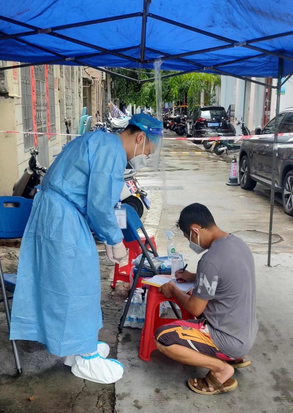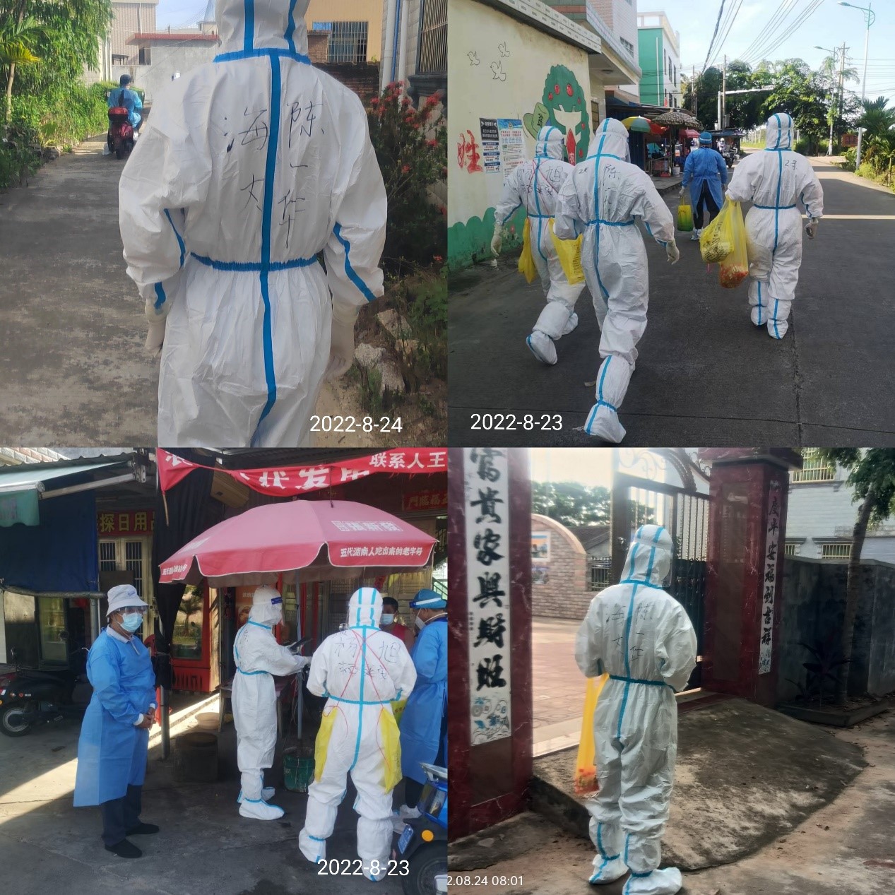 和医护人员组队后,陈一华老师和队员们分别挨家挨户上门协助医护人员开展核酸检测并采集核酸信息。在厚厚的防护服和防护面罩的包裹下,他们的容貌难以被看清,他们全副武装“笨拙”地穿梭在万城镇车头村各区域,脚踏水泥路和泥路挨家挨户采集信息。闷热不透气的防护服、两层胶皮手套、N95医用口罩、防护面罩全部规范穿戴上后,在炎热的天气环境中,汗水很快就滴落下来。每天早上6:30出发,每人完成100余名村民的信息采集任务完成后,全身已被汗水浸湿,脚下的外层防护脚套也被磨烂。谈及抗疫支援,陈一华说道,自己尽力以责任心、细心和耐心做好这份志愿工作。