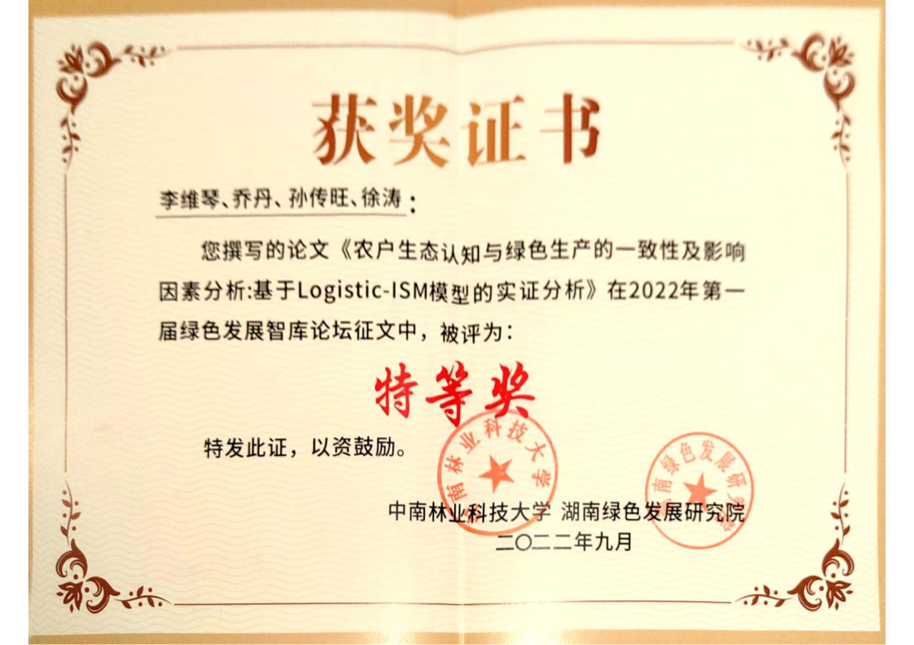 教师徐涛、孙传旺和乔丹共同指导的2021级农林经济管理专业硕士研究生李维琴撰写的《农户生态认知与绿色生产的一致性及影响因素分析:基于Logistic-ISM模型的实证分析》一文获得“特等奖”,李维琴受邀参加线下研讨会;由黄色网站
