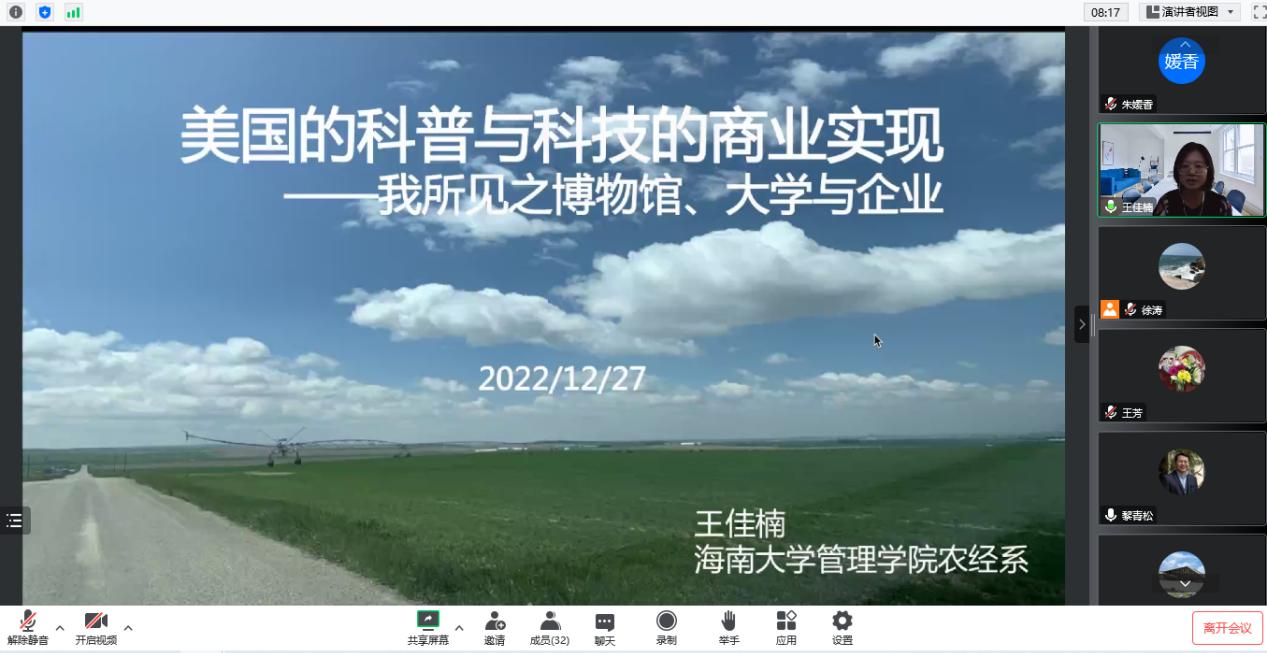 12月27日下午,尖峰热带农经驿站第1期邀请到管理学院农经系王佳楠副教授作了主题为《美国的科普与科技的商业实现——我所见之博物馆、大学与企业》的访学报告。报告会由农经系副系主任徐涛主持,黄色网站