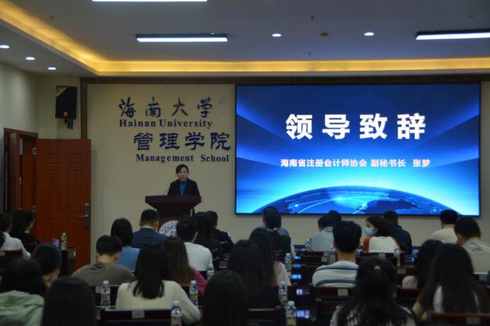 海南省注册会计师协会张梦副秘书长为我们今天的活动致辞,她介绍了注册会计师行业的整体情况,分别从注册会计师是对自身能力的证明、是社会认可度和含金量的象征、是拓宽职业前景和专业视野的选择、是职业道德和精神品质的体现四个方面介绍注册会计师行业的吸引之处,最后对同学们发出了诚挚的邀请。