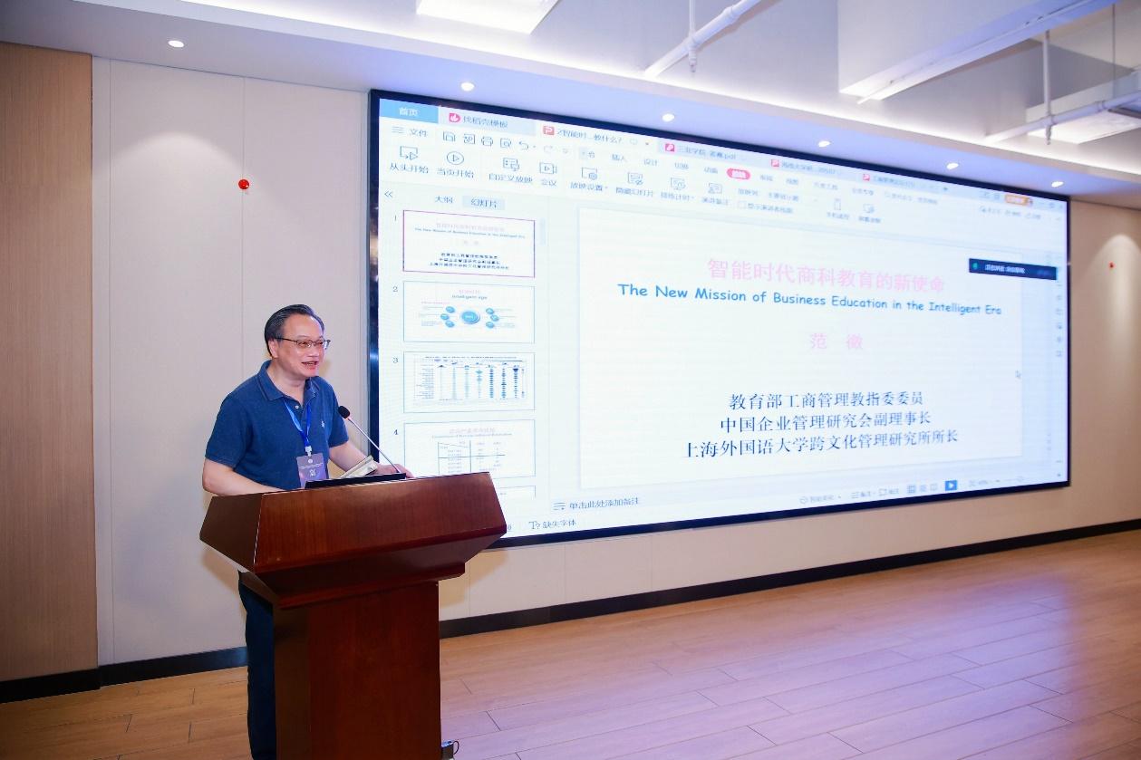 教育部工商管理类专业教学指导委员会委员、上海外国语大学国际工商管理学院首任院长范徵教授分享了《智能时代商科教学的新使命》。他从历次产业革命的比较入手,提出智能时代应该教什么、应该学什么。范徵教授指出课程设置应该体现出学习知识体系的价值和作用、知识体系、相关技术和工具、方法论等。智能时代商学院不单纯教授显性的知识,更要学习隐性的思维。因此,《整合管理思维》课程的目的旨在通过阅读管理专业经典,使学生学会自我获取知识、并能融会贯通,学习管理大师的思维与心智模式,逐步养成探索、创新工商管理实践方法的能力。