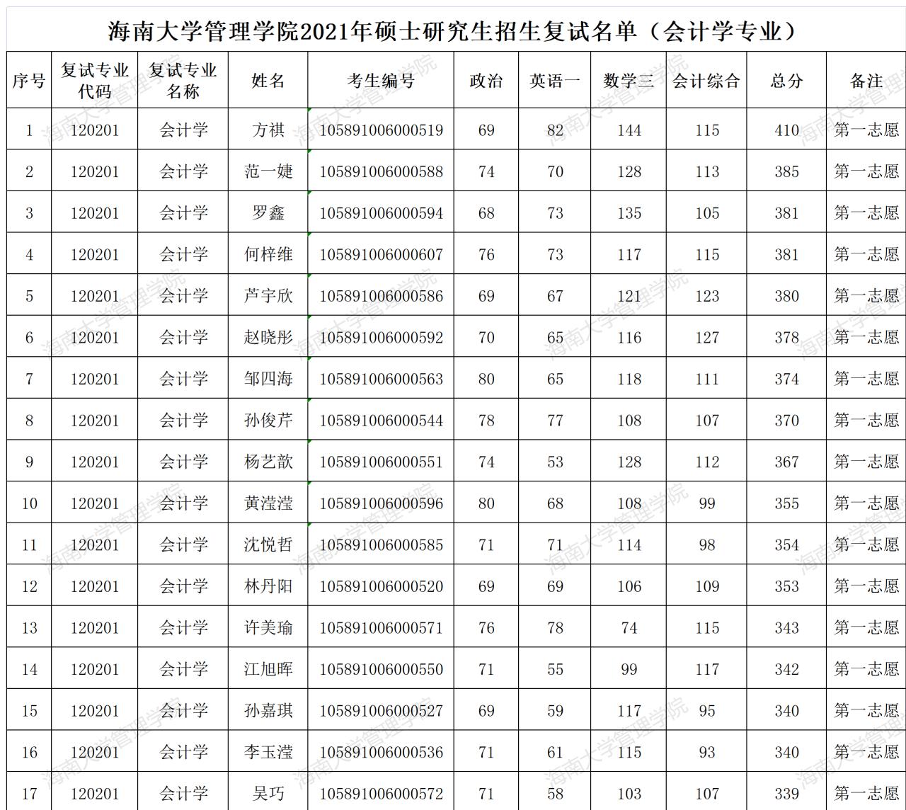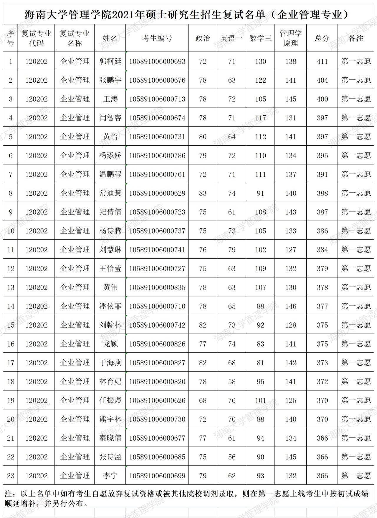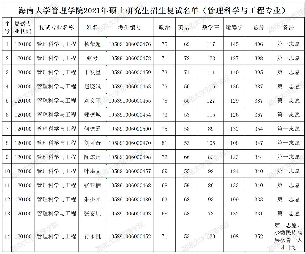 管理学院2021年硕士研究生招生复试录取工作办法》,会计学专业复试比例为120%,复试人数17人;管理科学与工程专业复试比例为120%,复试人数14人(含1名专项计划);企业管理专业复试比例为120%,复试人数23人。如遇考生自愿放弃复试资格或被其他院校提前调剂录取,则在第一志愿上线考生中按初试成绩顺延增补,并另行公布。