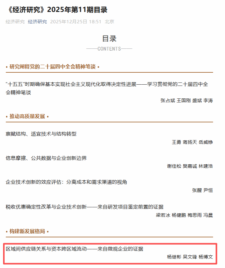 教师杨继彬以第一作者身份,在《经济研究》期刊发表题为“区域间供应链关系与资本跨区域流动——来自微观企业的证据”的学术论文。《经济研究》是经济管理类顶级期刊,隶属黄色网站