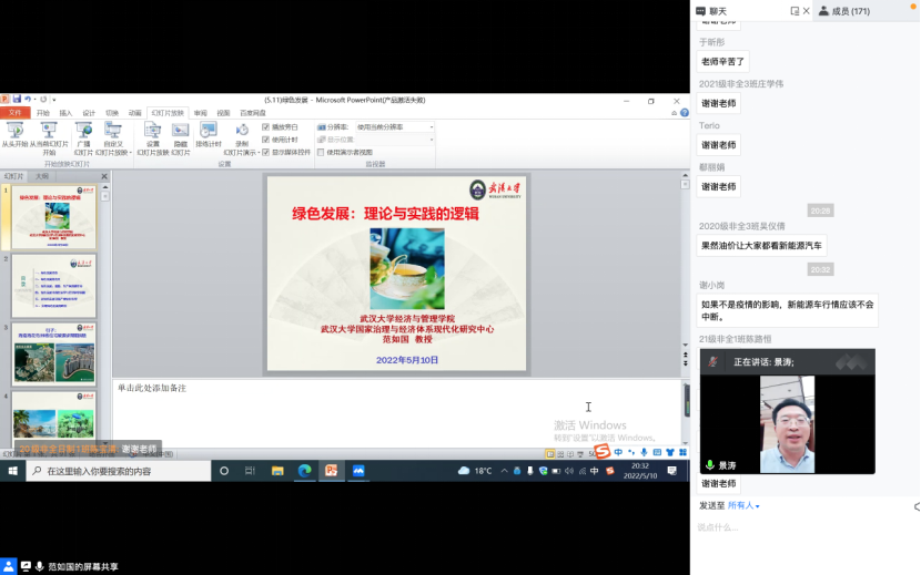 范如国教授围绕着“绿色发展:理论与实践逻辑“的主题从绿色发展理念,绿色发展的含义,绿色发展进程,能源、生产和消费革命,绿色发展中的经济和管理科学问题,以绿色发展引领产业绿色转型,实现绿色发展的路径等六个方面进行了深入浅出的讲解,并结合复杂性理论对我国绿色发展的学术研究和实践方向提出了独到见解。