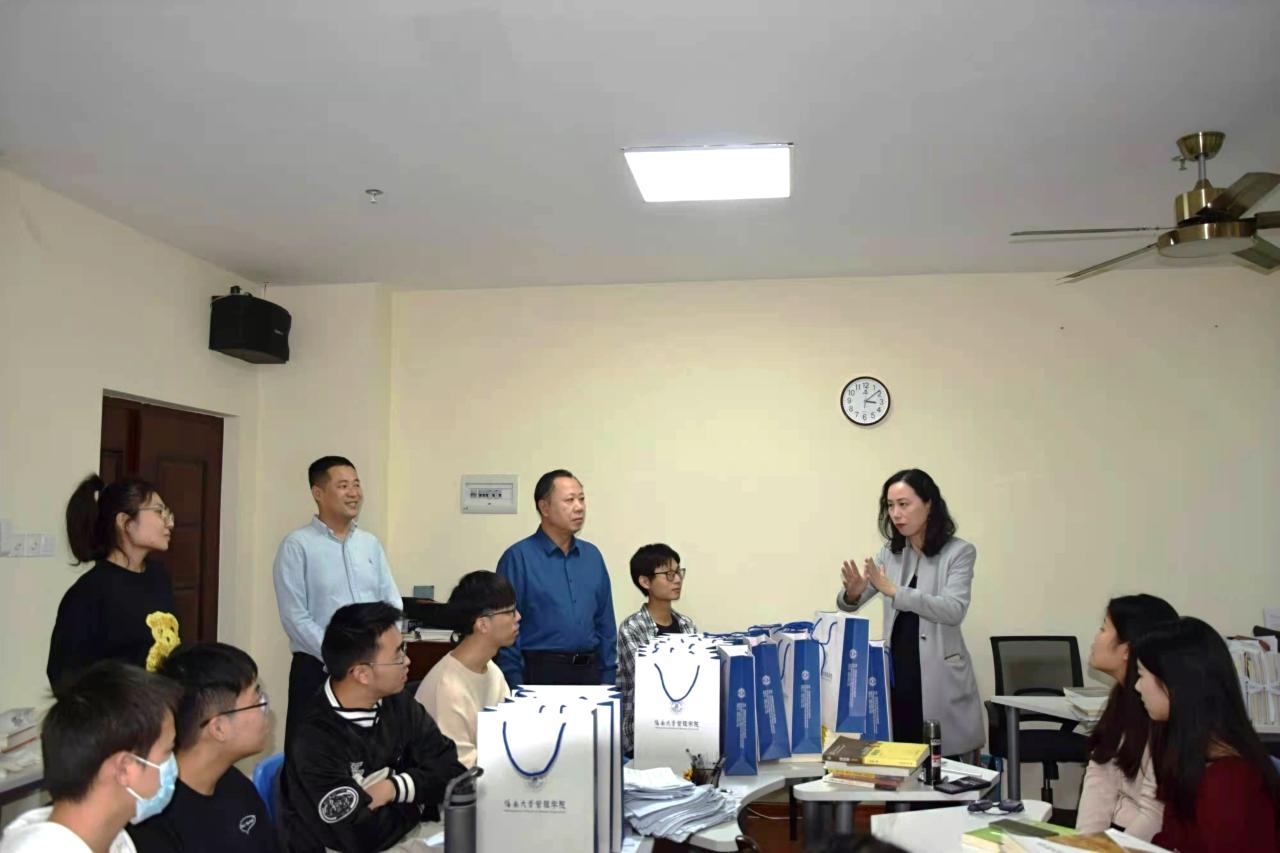 管理学院举行“东坡计划”之2022届考研送温暖活动暨冲刺动员会。管理学院院长唐宁玉、党委书记邢谷川、党委副书记易振、学生工作办公室主任肖亚奇老师在社科楼B319教室与学院考研学生代表进行亲切交谈。