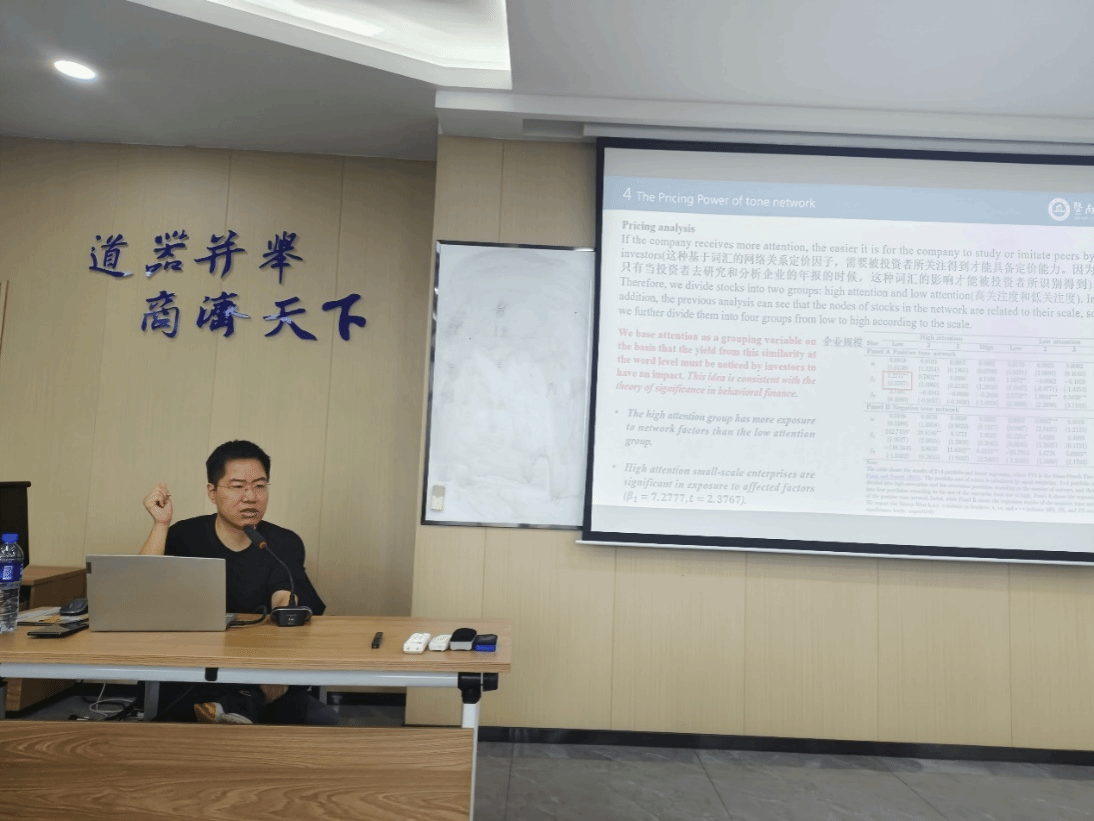 师生作题为“How Tone Networks Affect Stock Returns Based on Machine Learning Approaches”的专题讲座。讲座在社科楼B623举办,由学院金融系主任刘志峰教授主持,学院师生积极参与。