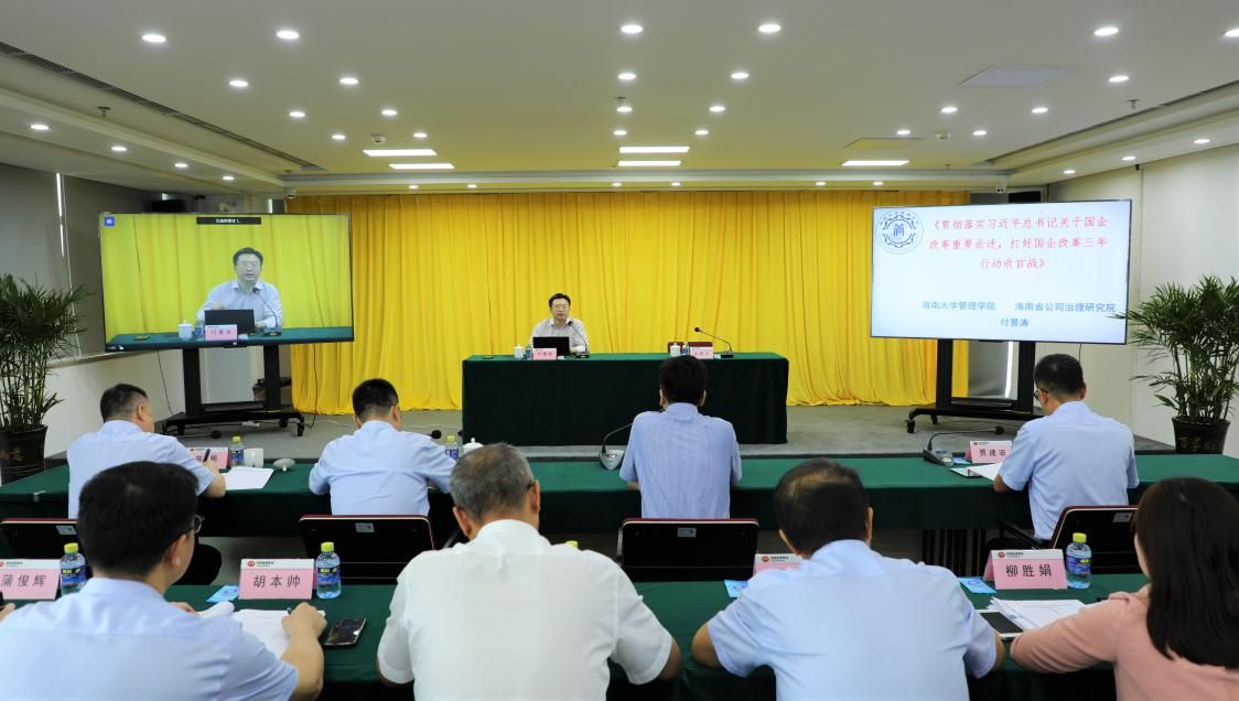 4月22日上午,黄色网站 管理学院副院长、海南省公司治理研究院副院长付景涛教授应邀赴国家能源集团海南电力有限公司,为该公司理论学习中心组学习(扩大)会作专题辅导,主题是《贯彻落实习近平总书记关于国企改革重要论述,打好国企改革三年行动收官战》,该公司党委书记、董事长李富军主持了理论学习中心组学习(扩大)会。