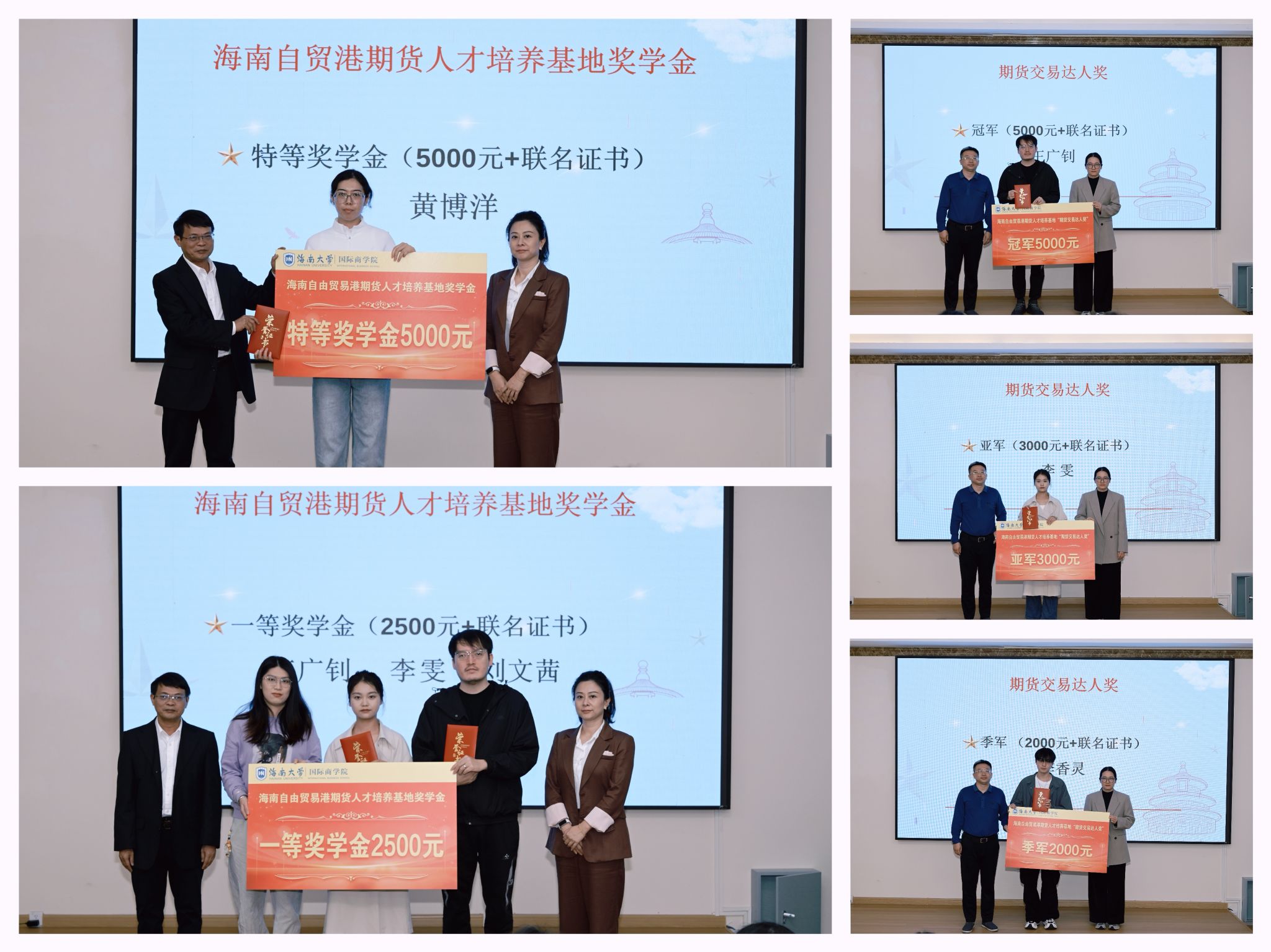 现场颁发了“海南自贸港期货人才培养基地奖”“期货交易达人奖”“金元期货·国新国证期货学业奖”“优秀毕业论文奖”及“校企合作教师奉献奖”等五类奖项,覆盖各层次学生与合作教师。学生代表分享了学习实践的收获与感悟。